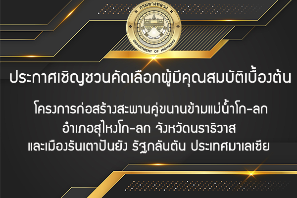 ประกาศเชิญชวนคัดเลือกผู้มีคุณสมบัติเบื้องต้น โครงการก่อสร้างสะพานคู่ขนานข้ามแม่น้ำโก-ลก ที่ อำเภอสุไหงโก-ลก จังหวัดนราธิวาส และเมืองรันเตาปันยัง รัฐกลันตัน ประเทศมาเลเซีย