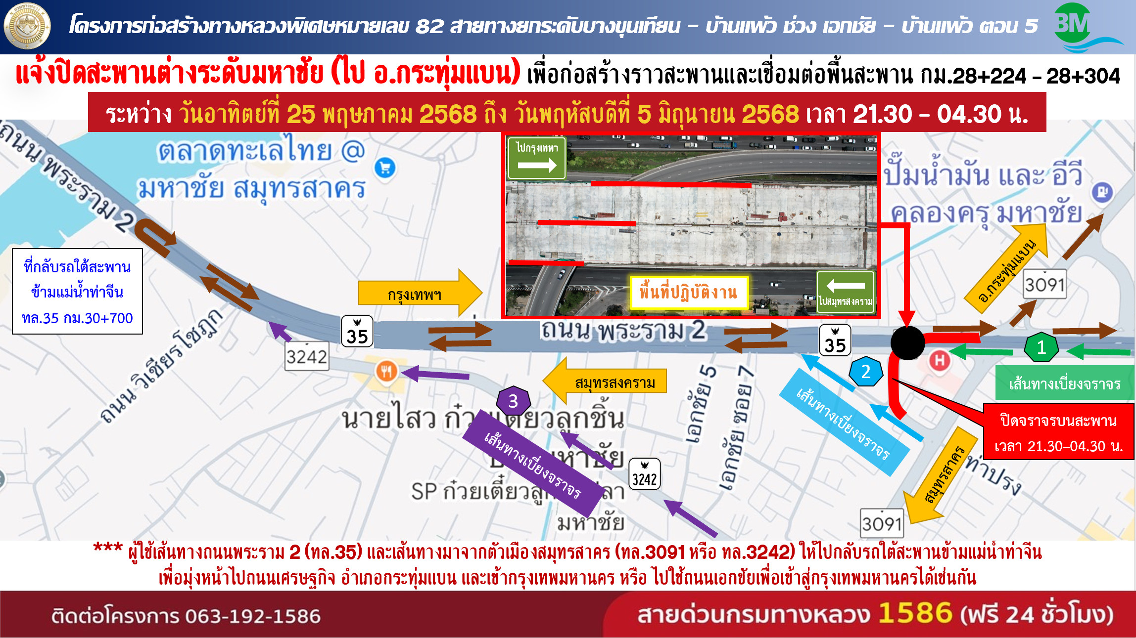 กรมทางหลวง โดยสำนักก่อสร้างสะพาน ขอแจ้งประชาสัมพันธ์ “ปิดการจราจรชั่วคราวสะพานต่างระดับมหาชัย (ไป อ.กระทุ่มแบน) บนทางหลวงหมายเลข 35 (ถนนพระรามที่ 2)”