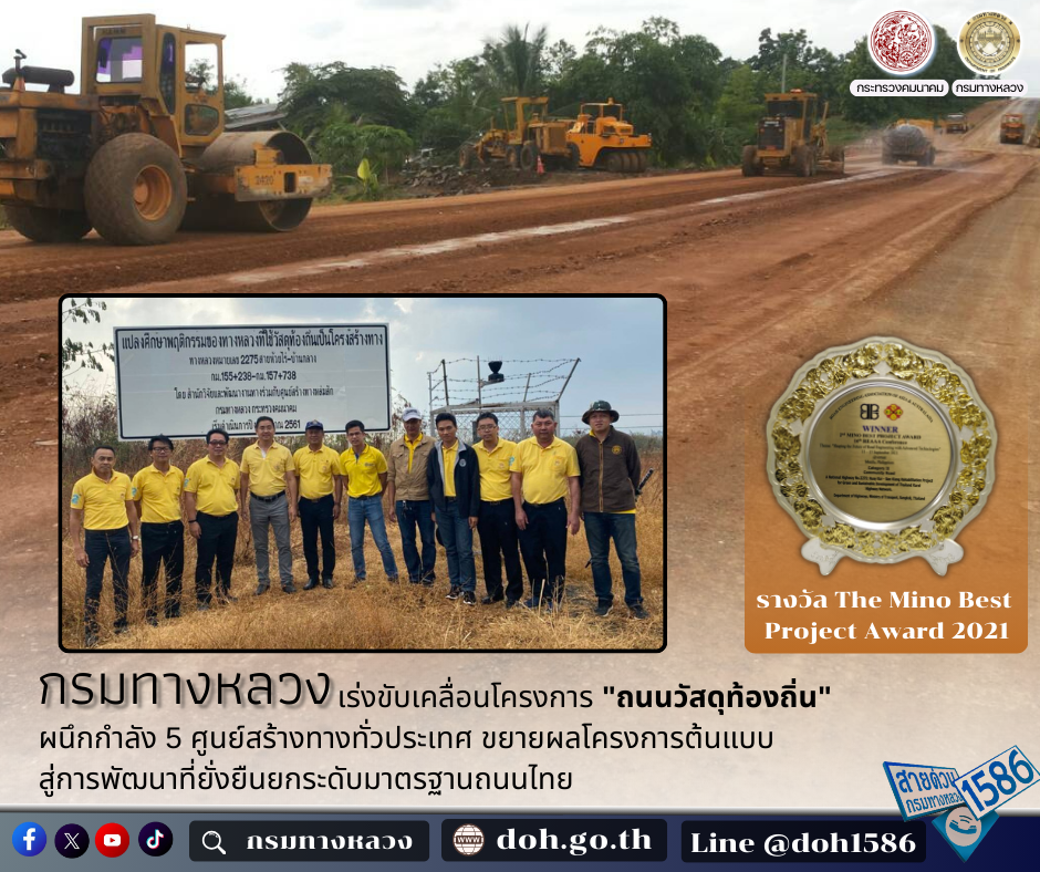 กรมทางหลวง เร่งขับเคลื่อนโครงการ "ถนนวัสดุท้องถิ่น" ผนึกกำลัง 5 ศูนย์สร้างทางทั่วประเทศ ขยายผลโครงการต้นแบบสู่การพัฒนาที่ยั่งยืนยกระดับมาตรฐานถนนไทย