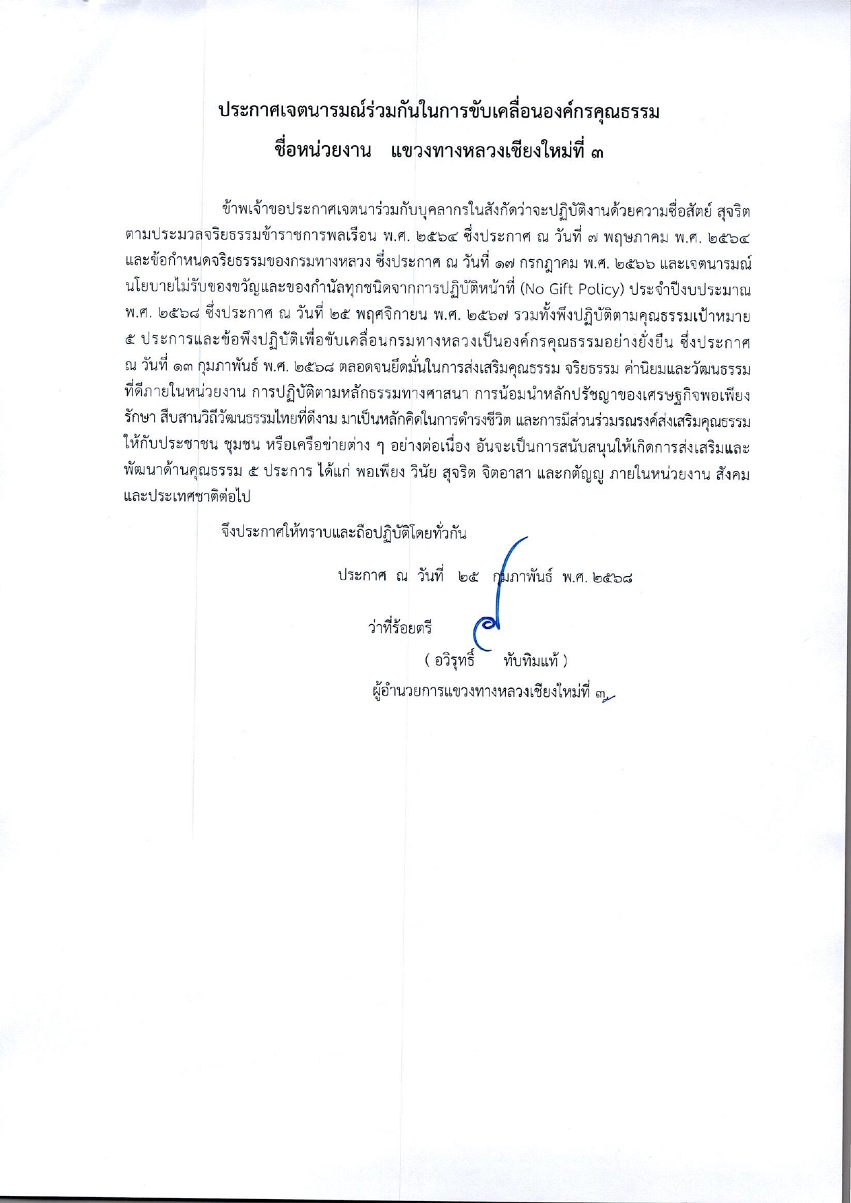 ประกาศเจตนารมณ์ร่วมกันในการขับเคลื่อนองค์กรคุณธรรม