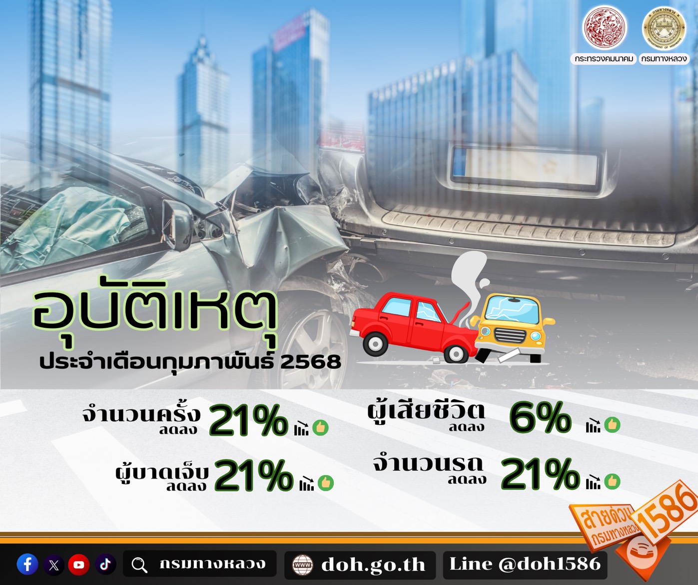 กรมทางหลวง สรุปอุบัติเหตุบนทางหลวงเดือนกุมภาพันธ์ 2568 พบอุบัติเหตุลดลง 21% สาเหตุหลักขับเร็วเกินกฎหมายกำหนด