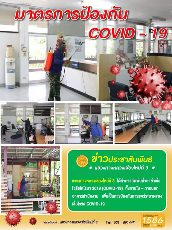 วันอาทิตย์ที่ 18 เมษายน 2564 แขวงทางหลวงเชียงใหม่ที่ 3 ได้ทำการฉีดพ่นน้ำยาฆ่าเชื้อภายในบริเวณอาคารสำนักงาน ห้องประชุม และบริเวณพื้นที่ด้านข้าง เพื่อเป็นการป้องกันการแพร่ระบาดของเชื้อไวรัสโควิด-19