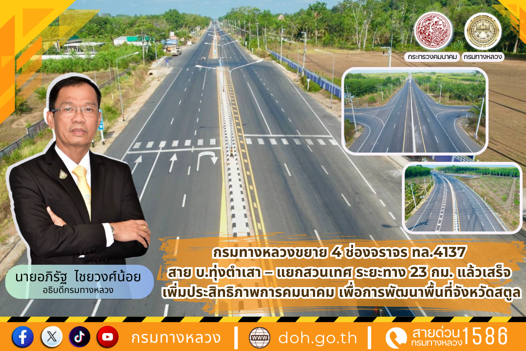 กรมทางหลวง โดยสำนักก่อสร้างทางที่ 1 ได้ดำเนินการก่อสร้างทางหลวงหมายเลข 4137 สาย บ.ทุ่งตำเสา - แยกสวนเทศ ระหว่าง กม.0+196 - กม.23+426 ระยะทาง 23.230 กิโลเมตร (กม.) พื้นที่ อ.ควนกาหลง และ อ.ท่าแพ จ.สตูล เป็น 4 ช่องจราจรแล้วเสร็จ เพิ่มประสิทธิภาพการเดินทางและการขนส่ง จ.สตูล