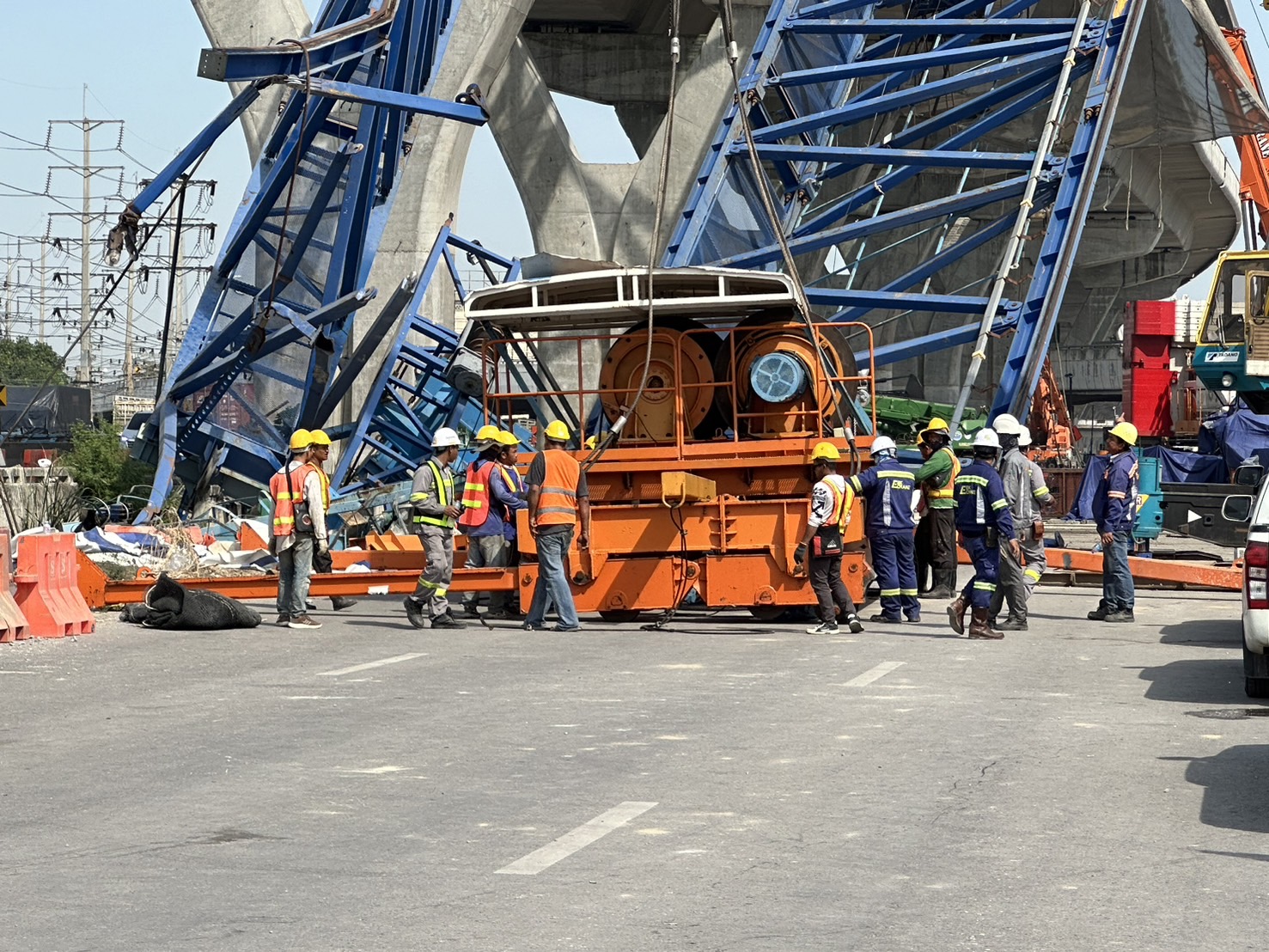 เมื่อวานนี้ (6 ธันวาคม 2567) ทีมวิศวกรได้ดำเนินการตัดชุด Winch ที่ติดกับโครงสร้างเหล็ก เสร็จสิ้นเป็นที่เรียบร้อย โดยดำเนินการตามขั้นตอนอย่างเคร่งครัด ได้แก่ ตัดย่อยอุปกรณ์ที่เกี่ยวข้องกับ Winch เช่น บันไดขึ้น-ลง, สลิง, แกะตู้ Control ออกจาก Winch ลงด้านล่าง, ตัดตะแกรงกันตกชิ้นแรก, ยกชุดรอก Winch ลงมาจากโครงเหล็ก, นำโครงเหล็กชุด Winch ออกจากพื้นที่ และตัดลวดสลิงที่กีดขวางโครงสร้างเหล็ก Truss ออก เพื่อเตรียมความพร้อมสำหรับการรื้อถอนโครงสร้างเหล็ก Truss ที่ได้รับความเสียหายในวันนี้ (7 ธันวาคม 2567) โดยเริ่มจากด้านหลังและยกลงมาด้านล่างล่าสุดเมื่อเวลา 10.00 น. ดร.อรรถสิทธิ์ ศิริสนธิ ที่ปรึกษาคณะอนุกรรมการสาขาวิศวกรรมโครงสร้างและสะพาน วิศวกรรมสถานแห่งประเทศไทย ในพระบรมราชูปถัมภ์ (วสท.) พร้อมด้วยทีมวิศวกรผู้เชี่ยวชาญ ได้ลงพื้นที่ตรวจสอบความพร้อมก่อนการรื้อย้าย Launching Gantry (LG) โดยมีการดำเนินการ ดังนี้