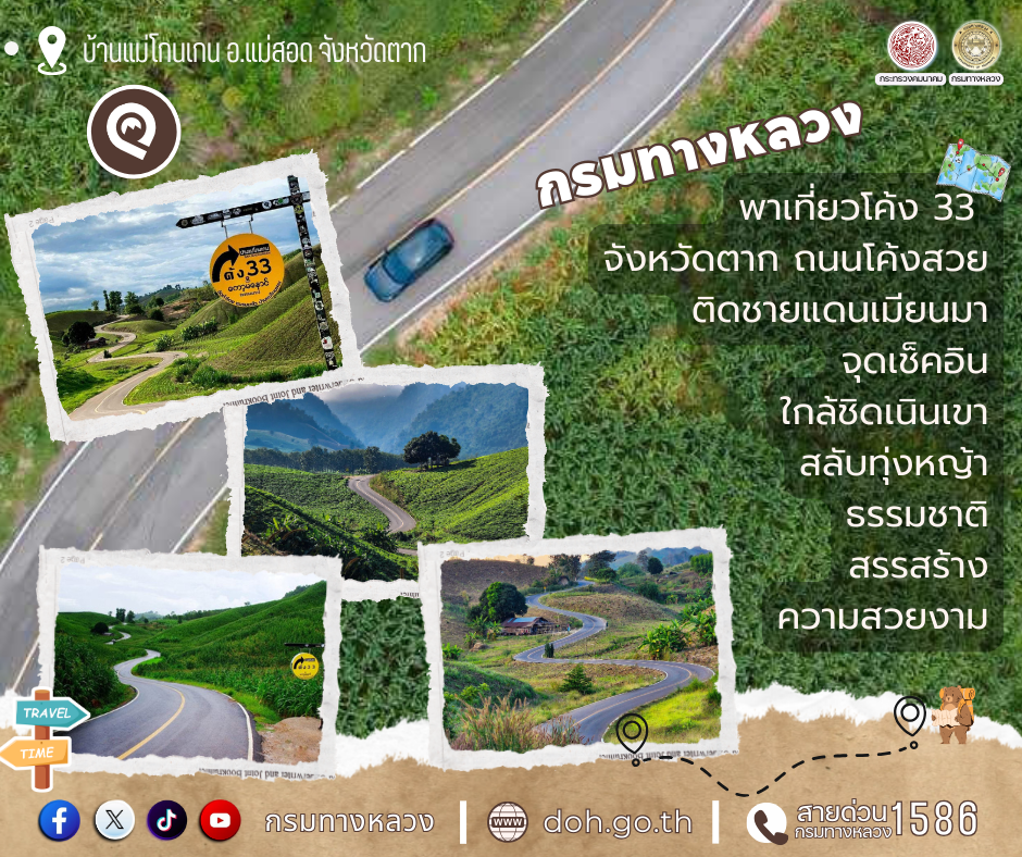 กรมทางหลวง (ทล.) ขอเชิญชวนประชาชนสัมผัสกับเส้นทางสายธรรมชาติ “ถนนโค้ง 33” บ้านแม่โกนเกน อำเภอแม่สอด จังหวัดตาก ชมถนนวิวสวยในไทยเหมือนอยู่ต่างประเทศ ธรรมชาติสองข้างทางแบบ 360 องศา จุดเช็คอินให้ถ่ายภาพกับธรรมชาติ และถนนที่สวยงามเป็นจุดหมายหนึ่งที่นักท่องเที่ยวที่รักการเดินทางมักจะปักหมุดเป็นจุดหมายในการพักผ่อนในช่วงวันหยุดยาว หรือผู้ที่ต้องการเติมพลังในการทำงานหลังจากที่ผ่านช่วงเวลาที่เหน็ดเหนื่อย จังหวัดตากเป็นอีกแลนด์มาร์กหนึ่งที่นักท่องเที่ยวนิยมเดินทางไปท่องเที่ยวกับธรรมชาติเป็นจำนวนมาก เนื่องจากเป็นจังหวัดที่อยู่ใกล้ชิดกับธรรมชาติ มีเนินเขา ทุ่งหญ้า ถ้ำและธารน้ำตก ที่รอคอยให้นักท่องเที่ยว ไปเยี่ยมชมธรรมชาติที่สร้างสรรค์ความมหัศจรรย์ให้กับพื้นที่จังหวัดตากเป็นจำนวนมาก