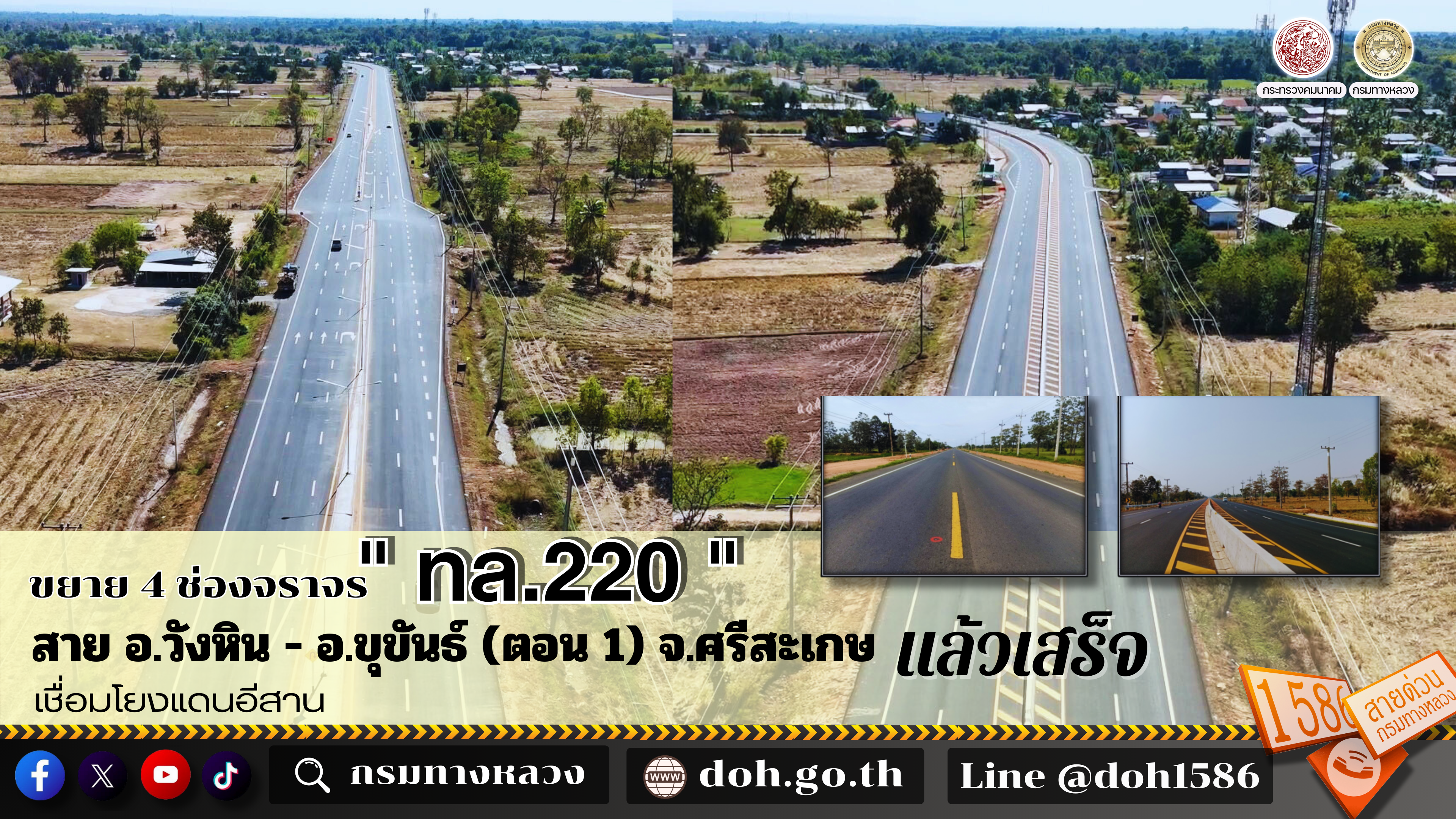 กรมทางหลวงก่อสร้างขยายทางหลวงหมายเลข 220 สาย อ.วังหิน - อ.ขุขันธ์ ตอน 1 จ.ศรีสะเกษ แล้วเสร็จ ส่งเสริมการพัฒนาด้านเศรษฐกิจ เพิ่มประสิทธิภาพการคมนาคมสู่ภาคอีสาน