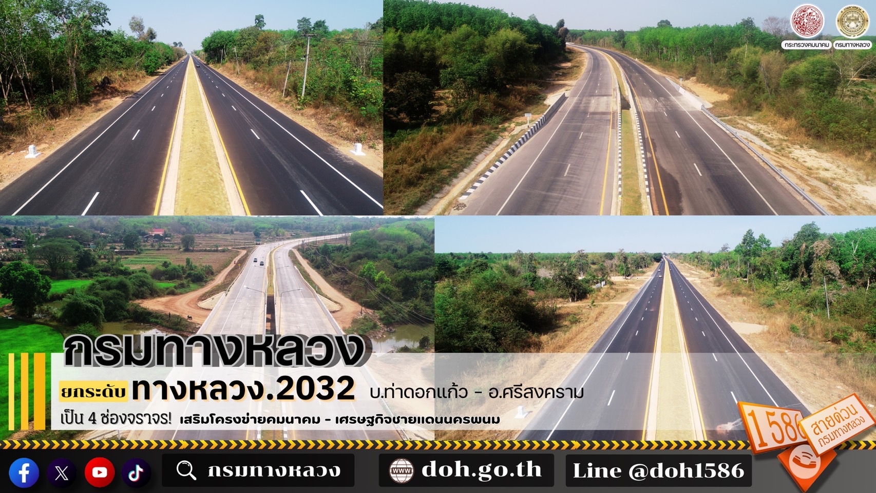กรมทางหลวง โดยสำนักก่อสร้างทางที่ 2 เปิดเผยว่า โครงการก่อสร้างทางหลวงหมายเลข 2032 สาย บ.ท่าดอกแก้ว - อ.ศรีสงคราม จ.นครพนม ได้ดำเนินการก่อสร้างแล้วเสร็จ และเปิดให้ประชาชนสัญจร ช่วยส่งเสริมการขนส่งสินค้าเกษตรกรรม เชื่อมโยงเส้นทางการท่องเที่ยวในจังหวัดนครพนม สกลนคร และบึงกาฬ ให้สะดวก รวดเร็ว และปลอดภัยยิ่งขึ้น