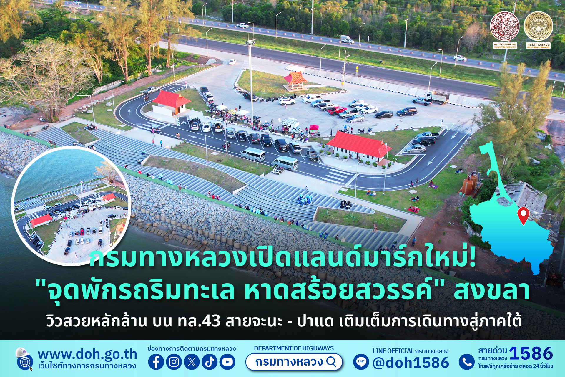 กรมทางหลวง โดยแขวงทางหลวงสงขลาที่ 2 (นาหม่อม) สำนักงานทางหลวงที่ 18 ขอเชิญชวนนักเดินทางทุกท่านแวะพักผ่อน ณ “จุดพักรถบริเวณหาดสร้อยสวรรค์” แห่งใหม่ล่าสุด บนทางหลวงหมายเลข 43 ตอนจะนะ - ปาแด ระหว่าง กม.ที่ 60 +100 - กม.ที่ 60 + 300 (ด้านซ้ายทาง) พื้นที่กว่า 5 ไร่ ได้ทำการก่อสร้างแล้วเสร็จและพร้อมเปิดให้บริการประชาชนแล้ววันนี้! เพื่ออำนวยความสะดวก ปลอดภัย และเป็นแหล่งพักผ่อนหย่อนใจสำหรับผู้ใช้เส้นทาง