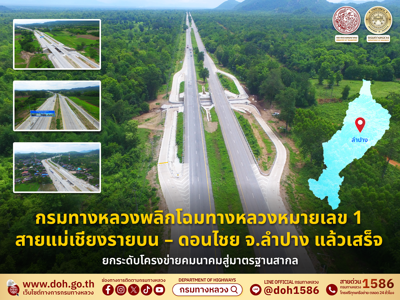 นายอภิรัฐ ไชยวงศ์น้อย อธิบดีกรมทางหลวง เปิดเผยว่า กรมทางหลวง โดยสำนักก่อสร้างทางที่ 1 ได้ดำเนินโครงการก่อสร้างบูรณะทางหลวงหมายเลข 1 สายแม่เชียงรายบน – ดอนไชย ครอบคลุมพื้นที่อำเภอแม่พริก จังหวัดลำปาง ตั้งแต่ กม.ที่ 583+216 ถึง กม.ที่ 593+569 รวมระยะทางทั้งสิ้น 10.353 กิโลเมตร แล้วเสร็จสมบูรณ์ เพื่อยกระดับมาตรฐานและความปลอดภัยของการคมนาคมขนส่งในพื้นที่ ตามแผนกิจกรรมบริหารจัดการลำดับชั้นทางหลวงเพื่อเพิ่มประสิทธิภาพและความปลอดภัยของกรมทางหลวง
