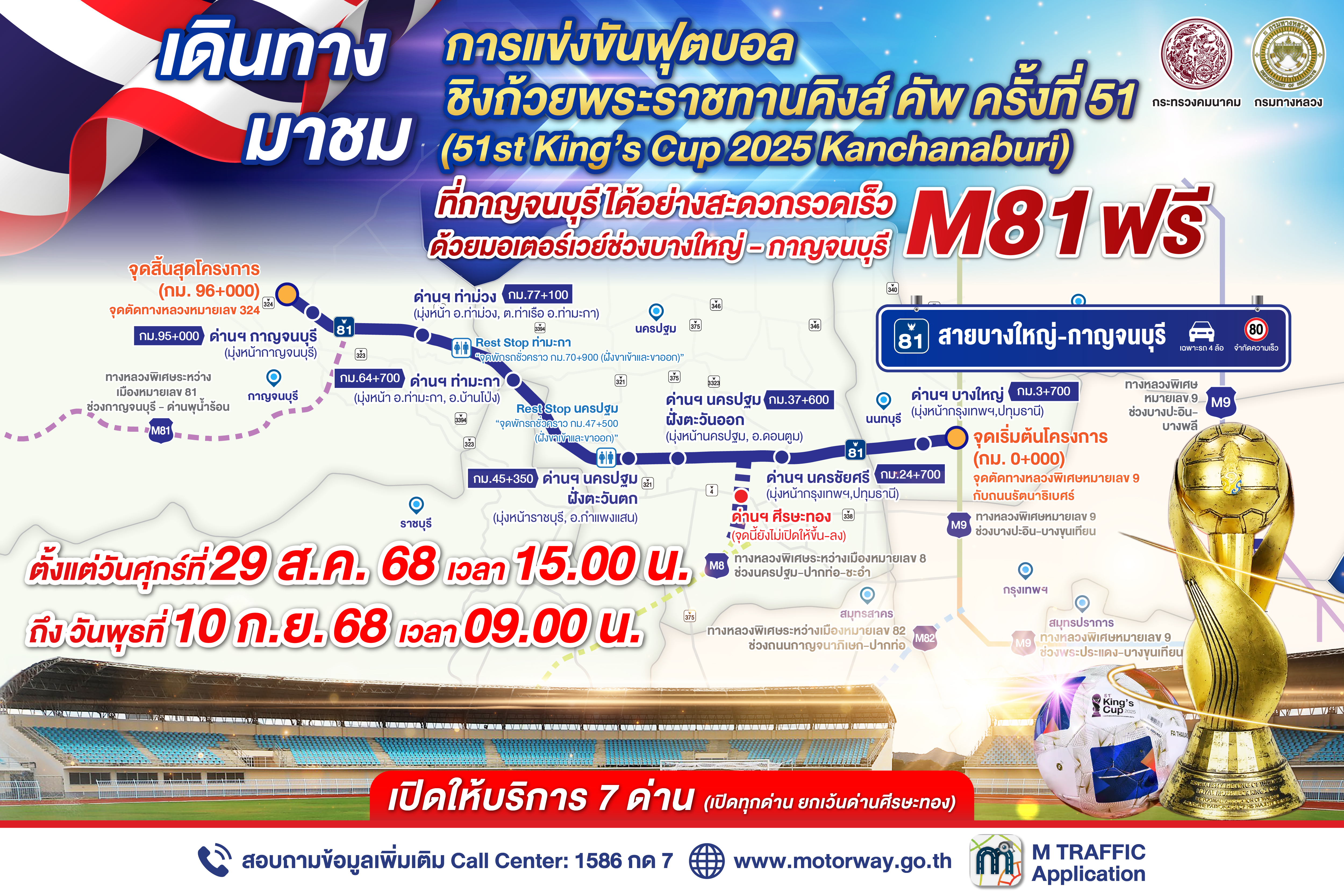กรมทางหลวง เปิดทดลองให้บริการทางหลวงพิเศษระหว่างเมืองหมายเลข 81 สายบางใหญ่ – กาญจนบุรี (มอเตอร์เวย์ M81) ระยะทาง 96 กิโลเมตรตลอดสาย โดยไม่เก็บค่าธรรมเนียมผ่านทาง ตั้งแต่วันศุกร์ที่ 29 สิงหาคม 2568 เวลา 15.00 น. ไปจนถึง วันพุธที่ 10 กันยายน 2568 เวลา 09.00 น. รวมทั้งสิ้น 13 วัน เพื่ออำนวยความสะดวกการแข่งขันฟุตบอลชิงถ้วยพระราชทานคิงส์คัพ ครั้งที่ 51 ประจำปี 2568 ซึ่งจัดขึ้นระหว่างวันที่ 1 – 9 กันยายน 2568 ณ สนามกีฬากลางจังหวัดกาญจนบุรี (สนามกลีบบัว)