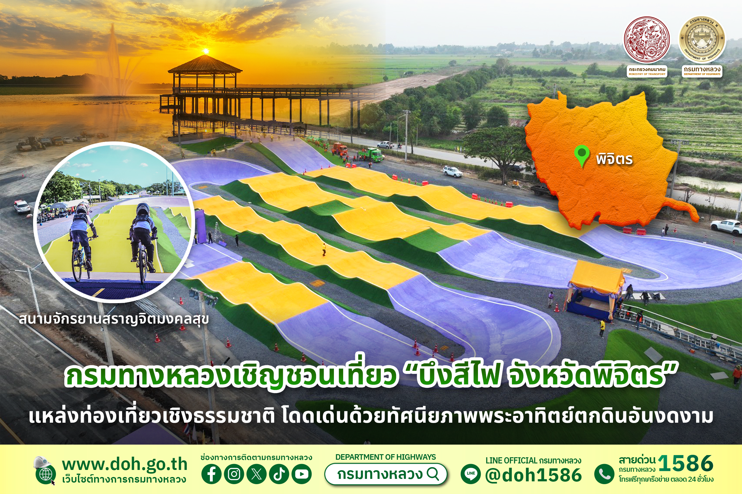 กรมทางหลวงเชิญชวนเที่ยวบึงสีไฟ จังหวัดพิจิตร เดินทางสะดวกห่างจากตัวเมืองพิจิตรใช้เวลาเพียง ไม่กี่นาที สัมผัสบรรยากาศเงียบสงบและสวยงาม พร้อมสนามจักรยานสราญจิตมงคลสุข แหล่งพักผ่อนและกิจกรรมกีฬาแห่งใหม่