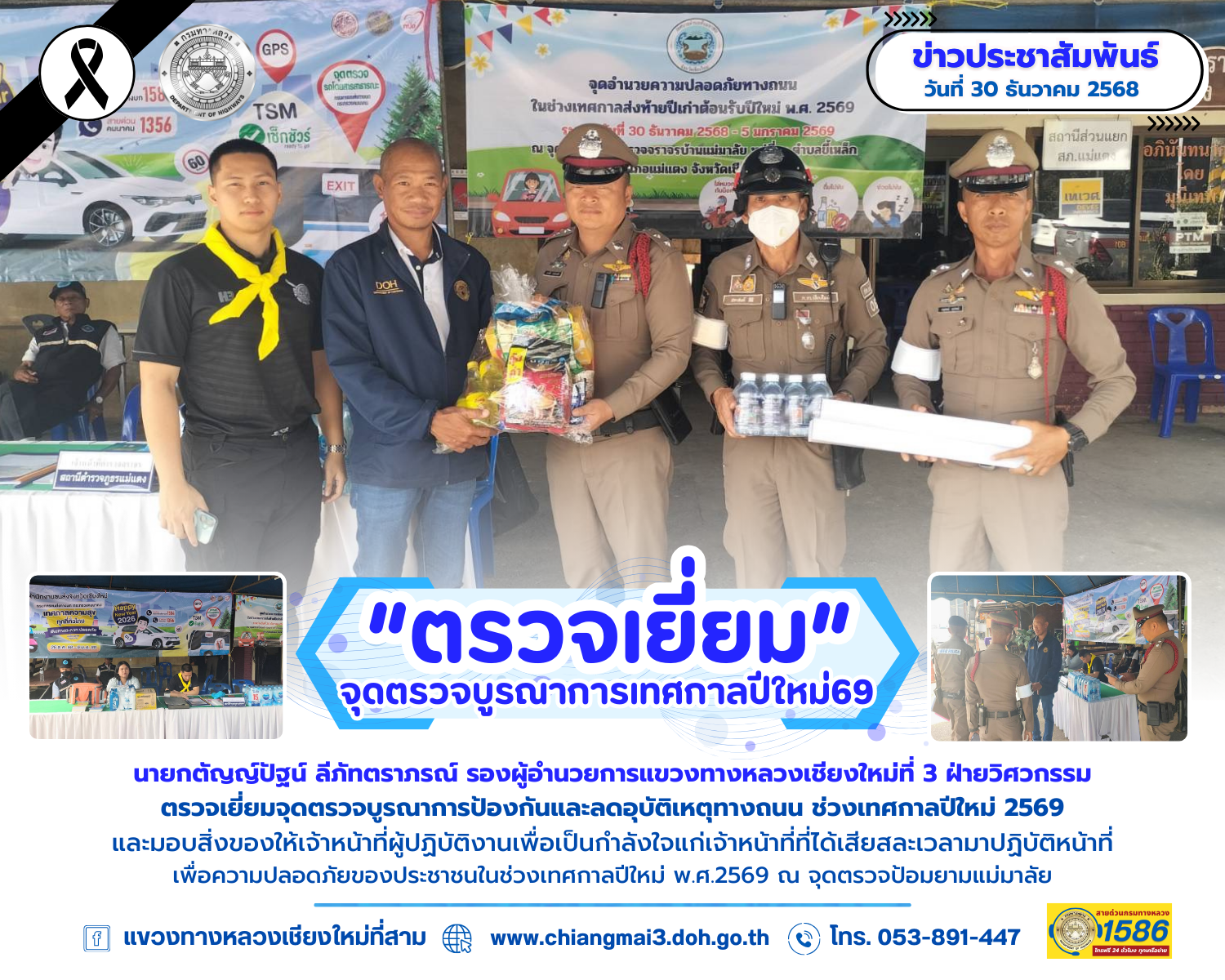 ข้อมูลข่าว : ตรวจเยี่ยมจุดตรวจบูรณาการป้องกันและลดอุบัติเหตุทางถนน ช่วงเทศกาลปีใหม่ 2569 ณ จุดตรวจป้อมยามแม่มาลัย