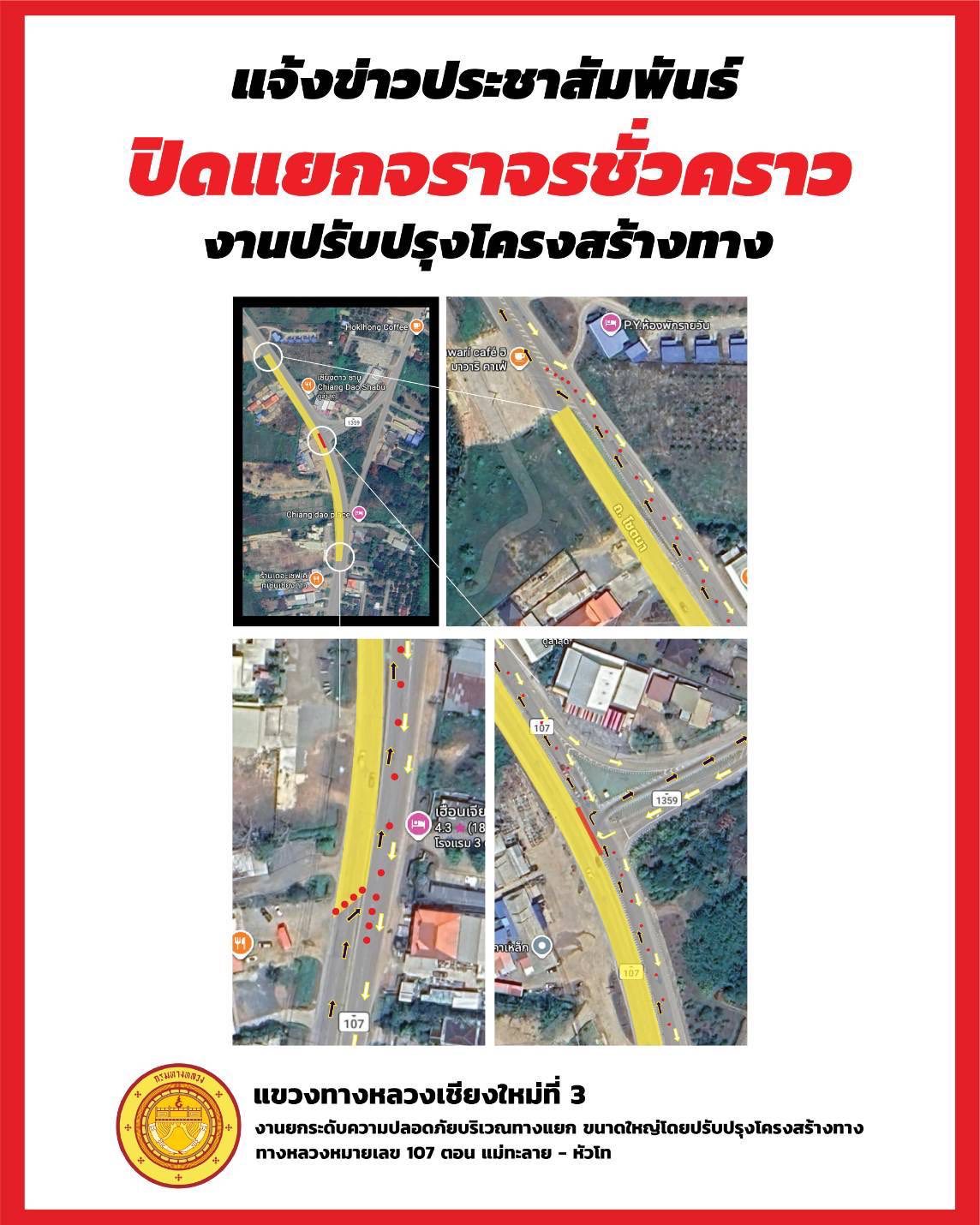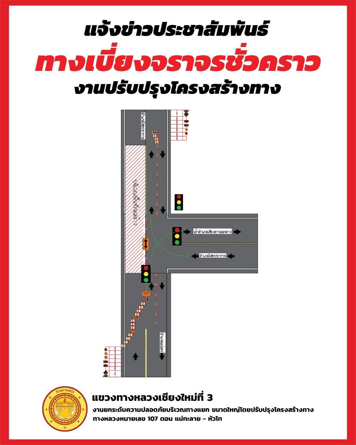 แขวงทางหลวงเชียงใหม่ที่ 3 กรมทางหลวง ขอแจ้งประชาสัมพันธ์ การปรับเบี่ยงการจราจรชั่วคราวระหว่างการก่อสร้าง งานยกระดับความปลอดภัยบริเวณทางแยกขนาดใหญ่